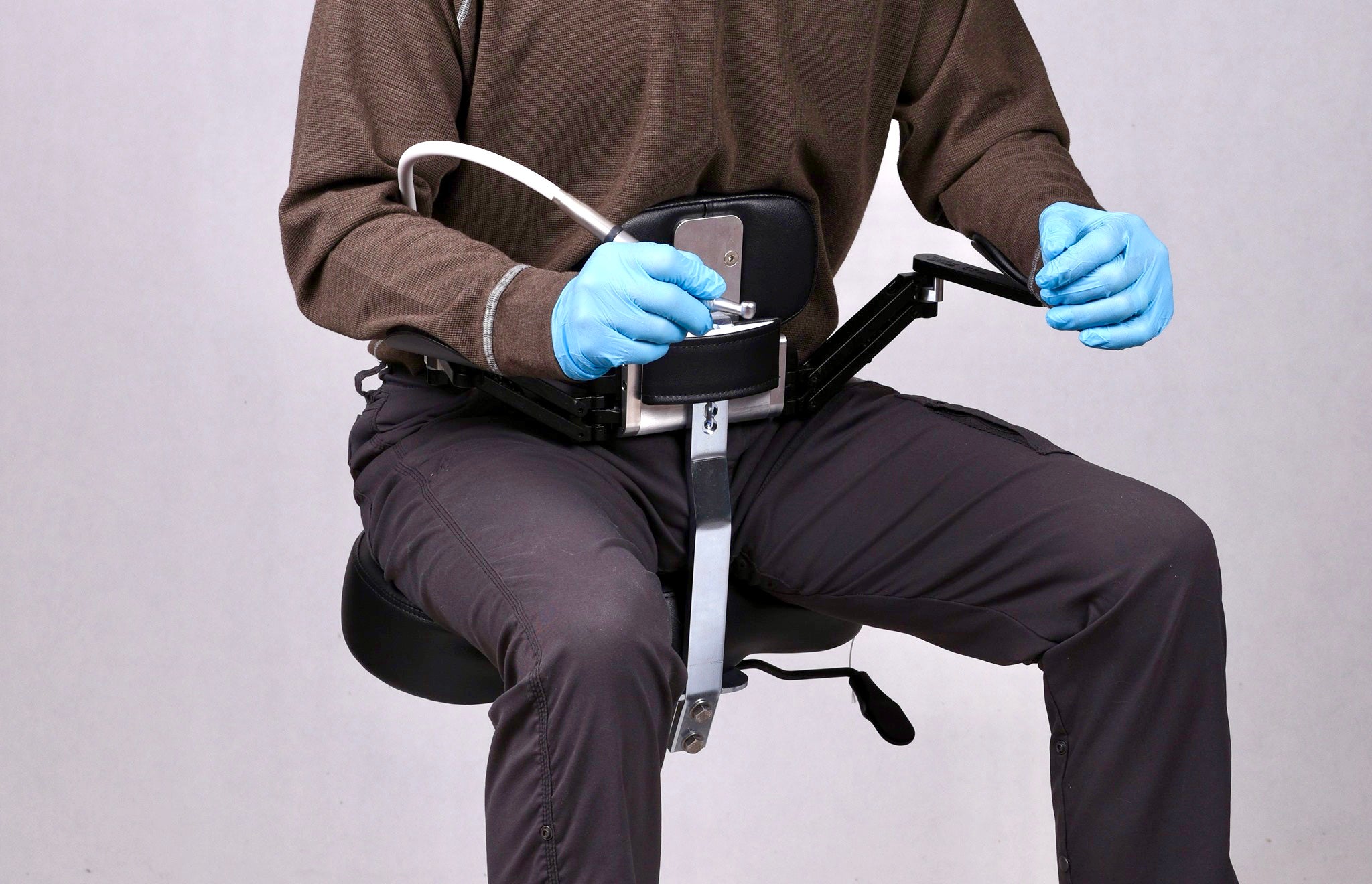 The Orbital Surgical (S) is a hands free height adjustable anterior support system. The low center of gravity four wheeled base is the most compact and stable base in the surgical arena and will fit in any operative. It is fully adjustable including seat slide and tilt, chest pad height and independently adjustable armrests. This chair / stool provides precision positioning and works well with loupes. Full body support helps dentists avoid back, shoulder, neck, and arm pain. All Orbital chairs and stools are available with a saddle seat or our optional custom ergonomic seat.
